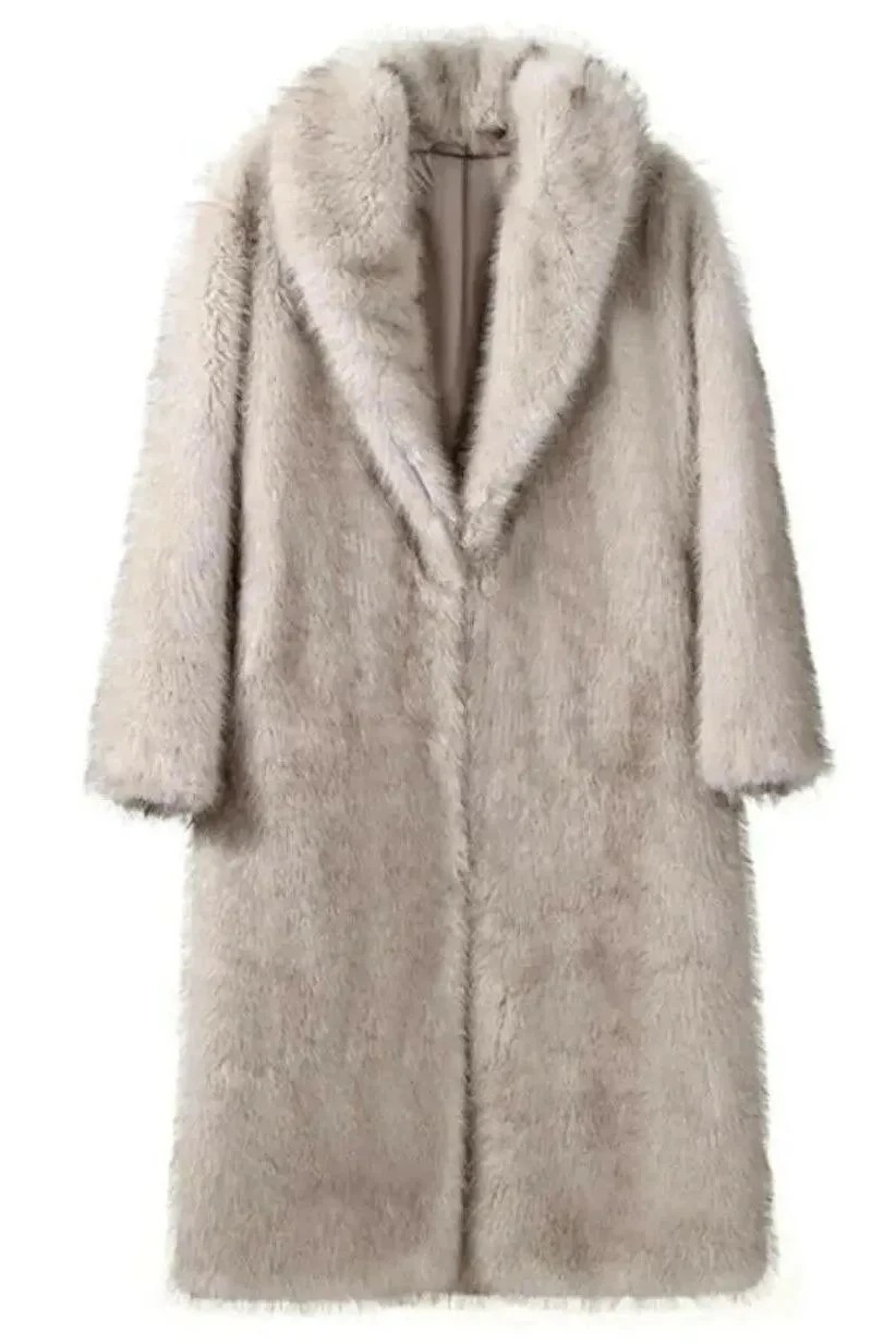 This luxurious faux fur coat combines elegance with the utmost comfort. With its classic, long cut and generous lapel collar, it adds a timeless and sophisticated touch to any outfit. Whether layered over an elegant dress or paired with jeans and boots, this coat is the perfect statement piece for style-conscious looks.